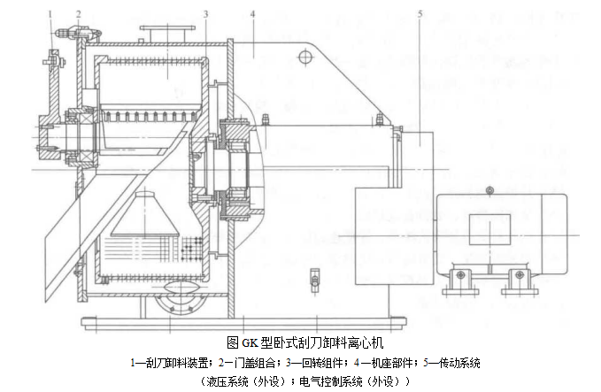 GK型臥式刮刀卸料離心機主要由刮刀機構,門蓋組件,轉鼓組件,機座組件,傳動系統(tǒng),液壓系統(tǒng)及電氣控制系統(tǒng)等部件組成.